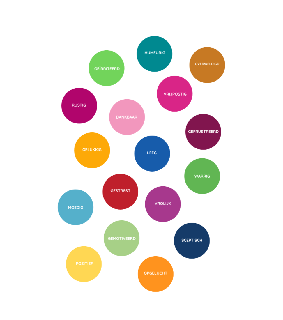 De geselecteerde stemmingen op de Mood Wall omvatten een breed scala aan emoties, van gemotiveerd tot onzeker, van geïnspireerd tot sceptisch. Natuurlijk zijn er meer emoties, maar er is bewust gekozen voor woorden die uitnodigen tot nadenken en gesprek. Complexe gevoelens, zoals jaloezie, worden bijvoorbeeld gevormd door onderliggende stemmingen zoals onzekerheid, frustratie of zelfs inspiratie. Door juist de basisstemmingen te benoemen, ontstaat een laagdrempelige ingang voor een gesprek dat kan verdiepen als dat nodig is.